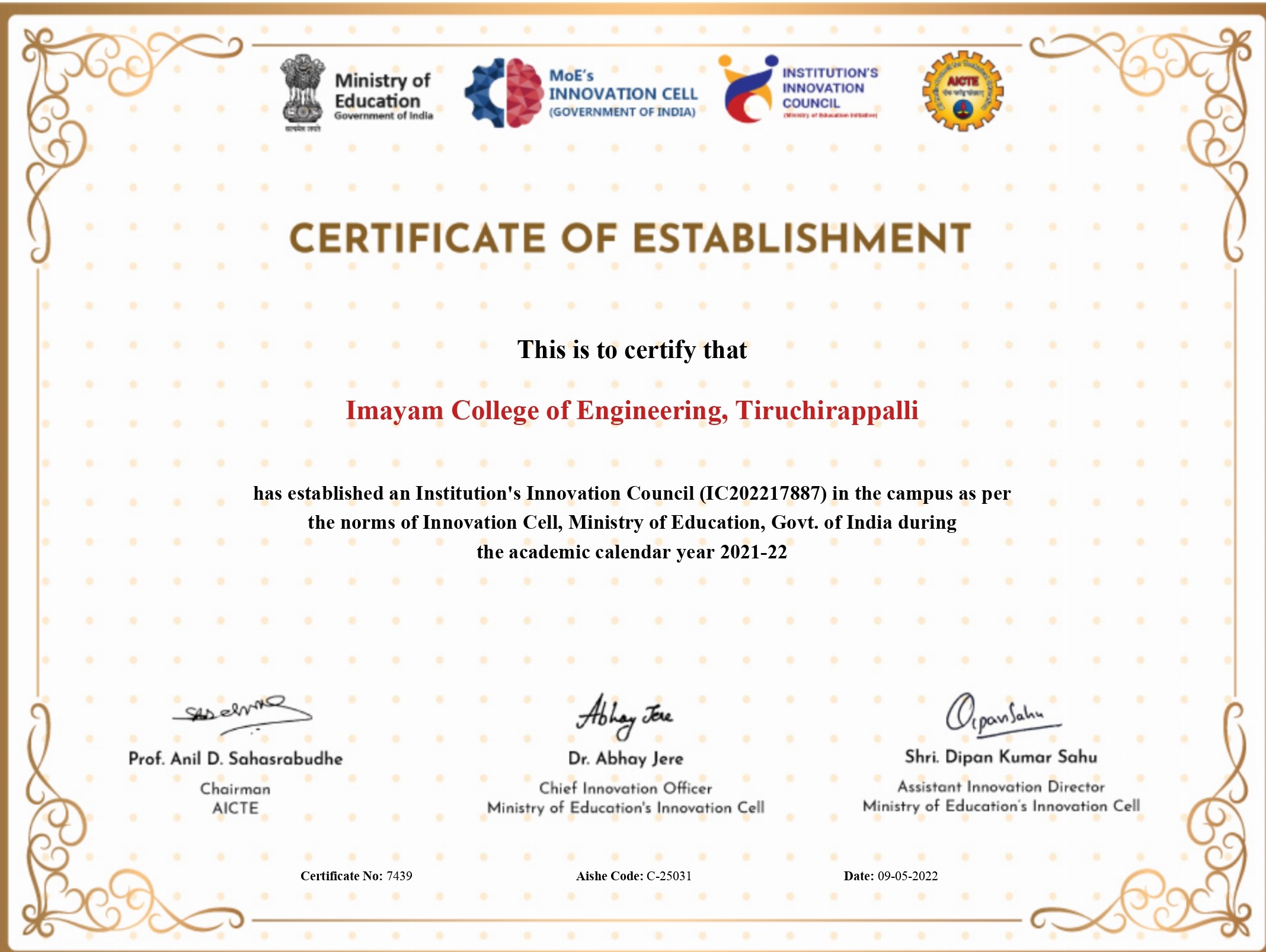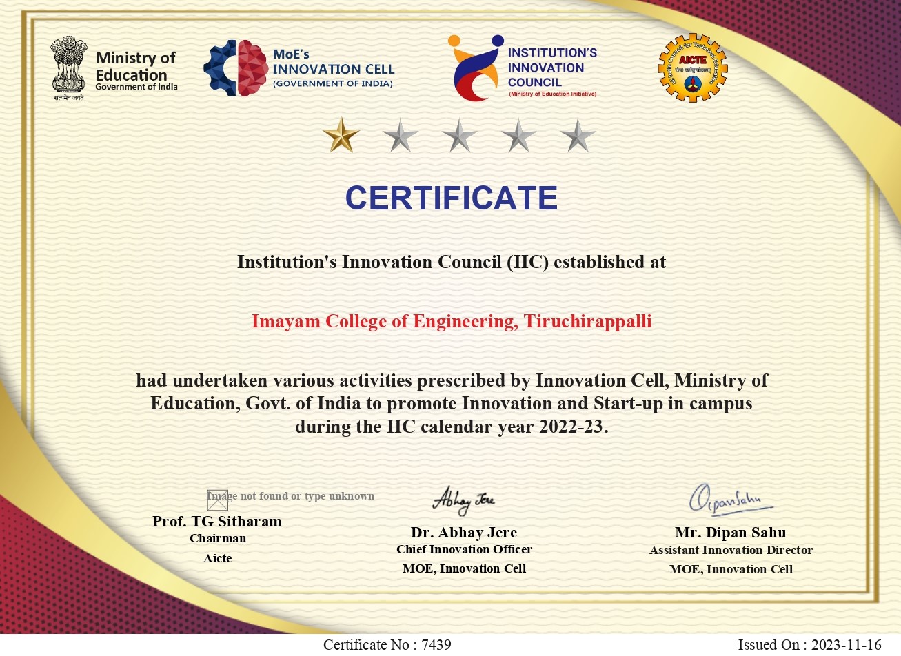 Ministry of Education (MoE), Govt. of India has established ‘MoE’s Innovation Cell (MIC)’ to systematically foster the culture of Innovation among all Higher Education Institutions (HEIs).The primary mandate of MIC is to encourage, inspire and nurture young students by supporting them to work with new ideas and transform them into prototypes while they are informative years.MIC has envisioned encouraging creation of ‘Institution’s Innovation Council (IICs) across selected HEIs.A network of IICs are established to promote innovation and entrepreneurship in the Institution through multitudinous modes leading to an innovation promotion ecosystem in the campuses. MIC has established Institution's Innovation Council in more than 2200 Instiutions till November 2020.